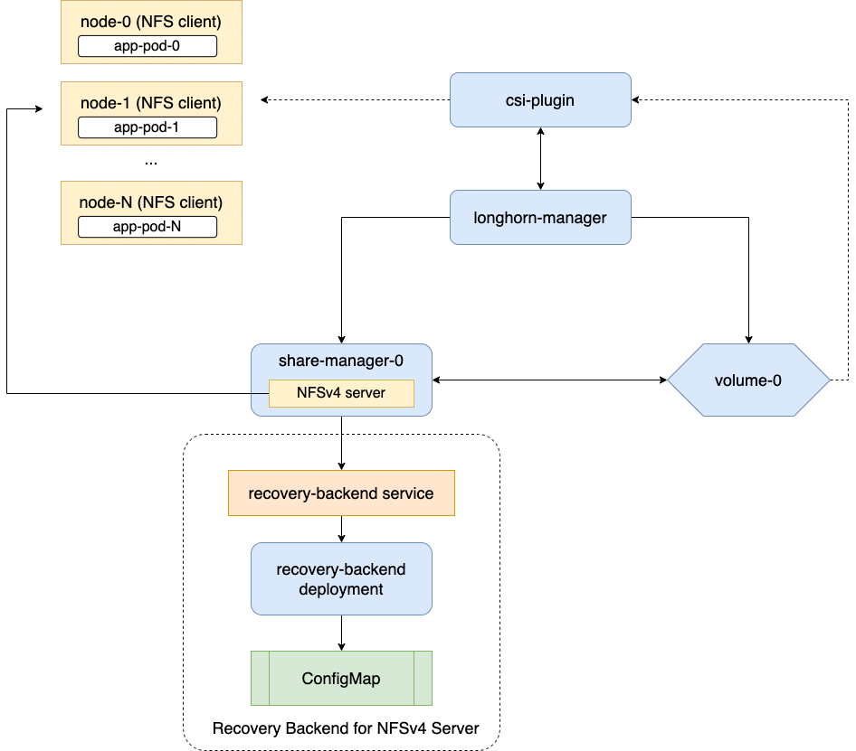 There is a dedicated recovery backend service for NFS servers in Longhorn system. When a client connects to an NFS server, the client’s information, including its hostname, will be stored in the recovery backend. When a share-manager Pod or NFS server is abnormally terminated, Longhorn will create a new one. Within the 90-seconds grace period, clients will reclaim locks using the client information stored in the recovery backend.