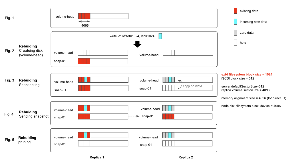 During rebuilding (while we have WO replica), in the Fig 3 above, if the incoming write IO is not 4096-byte aligned, we read full 4096-byte blocks from RW replicas (the source replica)then write that to all replicas. The PR for this solution is at https://github.com/longhorn/longhorn-engine/pull/745 and https://github.com/longhorn/longhorn-engine/pull/759